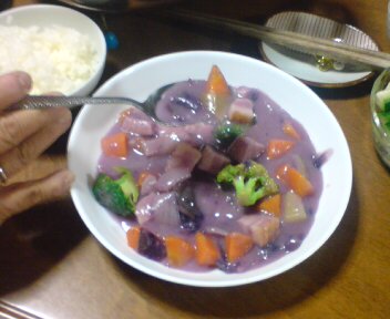 最初は普通のシチューの筈だったのに、おかんがこの芋も古いから使ってしもてと渡されたのがあろうことか紫芋。